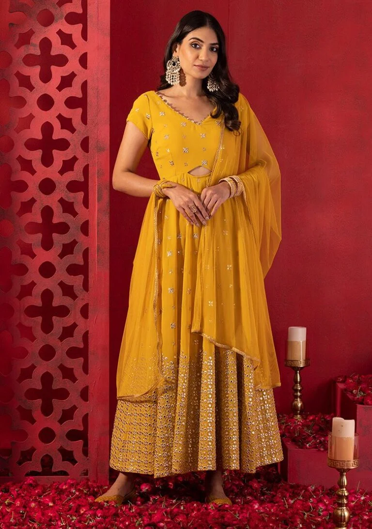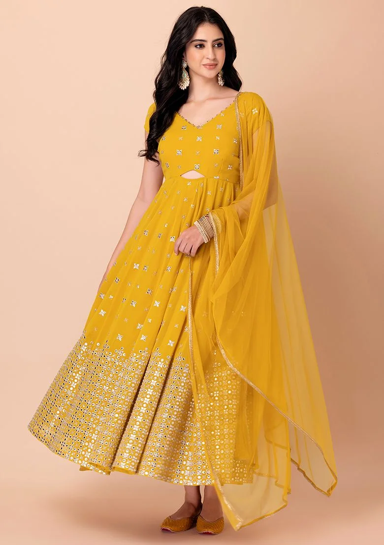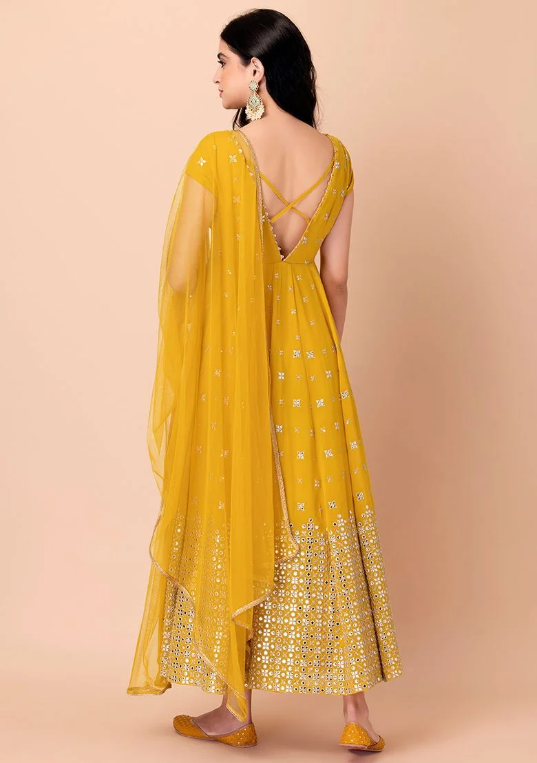 Mustard Yellow Mirror Sequin And Zari Embroidered Anarkali Suit With Mesh Dupatta – ILK00054